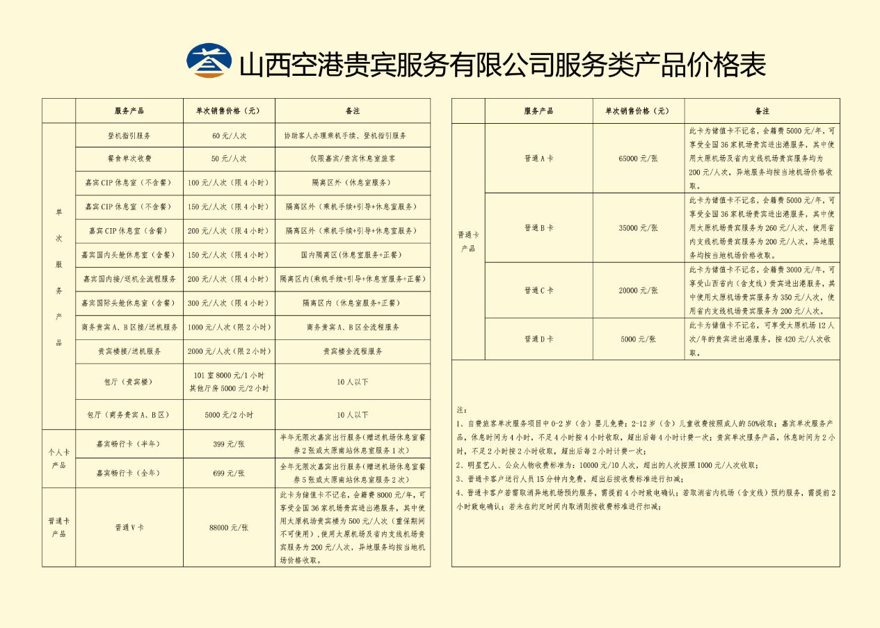 山西空港貴賓服務有限公司是山西航空產業集團有限公司與首都空港貴賓服務管理有限公司共同出資組建的合資公司,是為政務要客、商務貴賓、頭等艙(公務艙)、公務機旅客抵離太原機場提供貴賓接待服務的唯一專業機構。