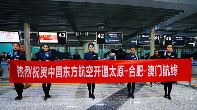 3月31日,太原機場正式開通太原=合肥=澳門航線。此次航線的開通,不僅恢復了太原至澳門的直航服務,還通過經停合肥的方式,進一步豐富了旅客出行選擇,為三地間的經濟、旅游及人文交流搭建了便捷的空中橋梁。 該航線由東方航空執飛,計劃每周一、二、四、六執行。去程航班號為MU5055,計劃于07:00從太原起飛,08:30抵達